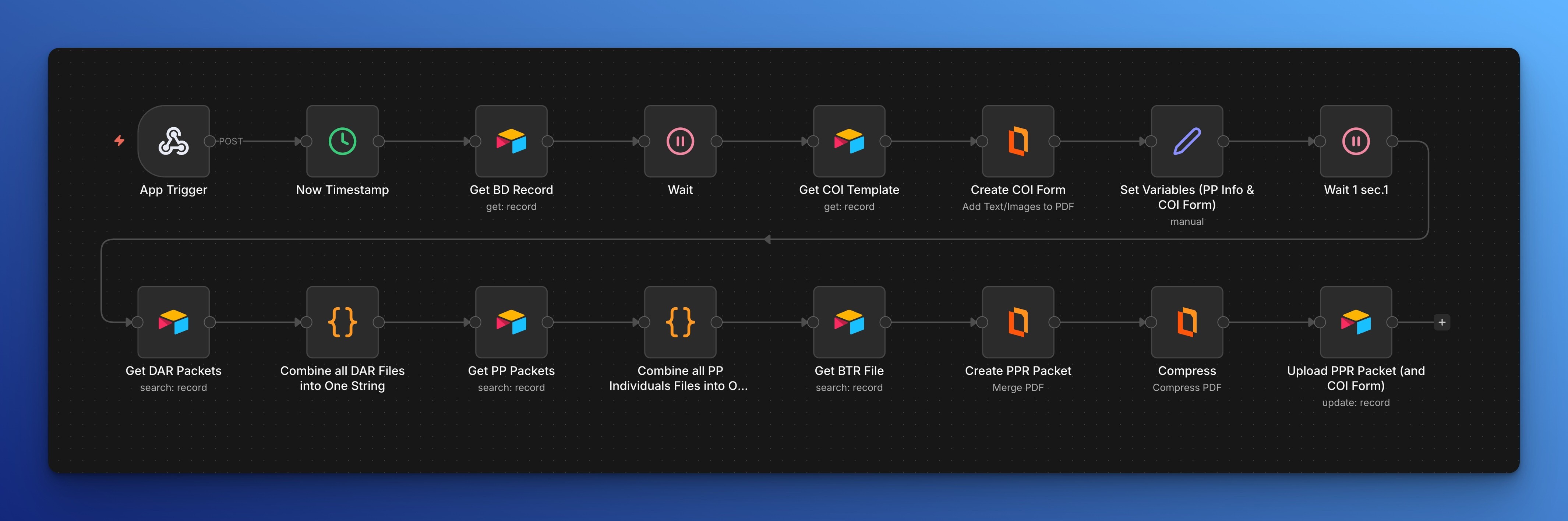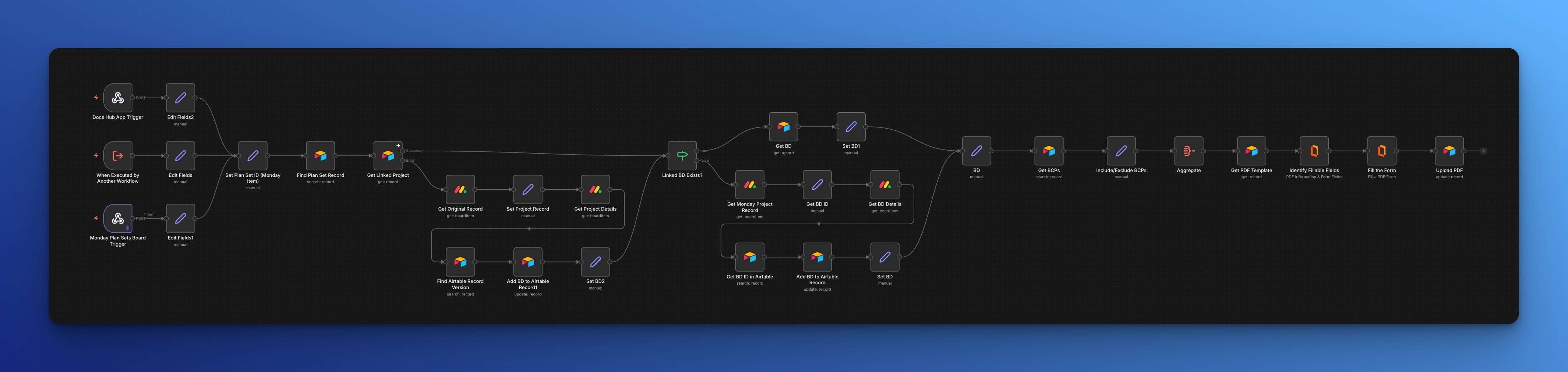 Created multiple automated workflows (12+ distinct processes) that handle document generation end-to-end. When a user clicks a button in the frontend, a webhook triggers the corresponding n8n workflow, which: