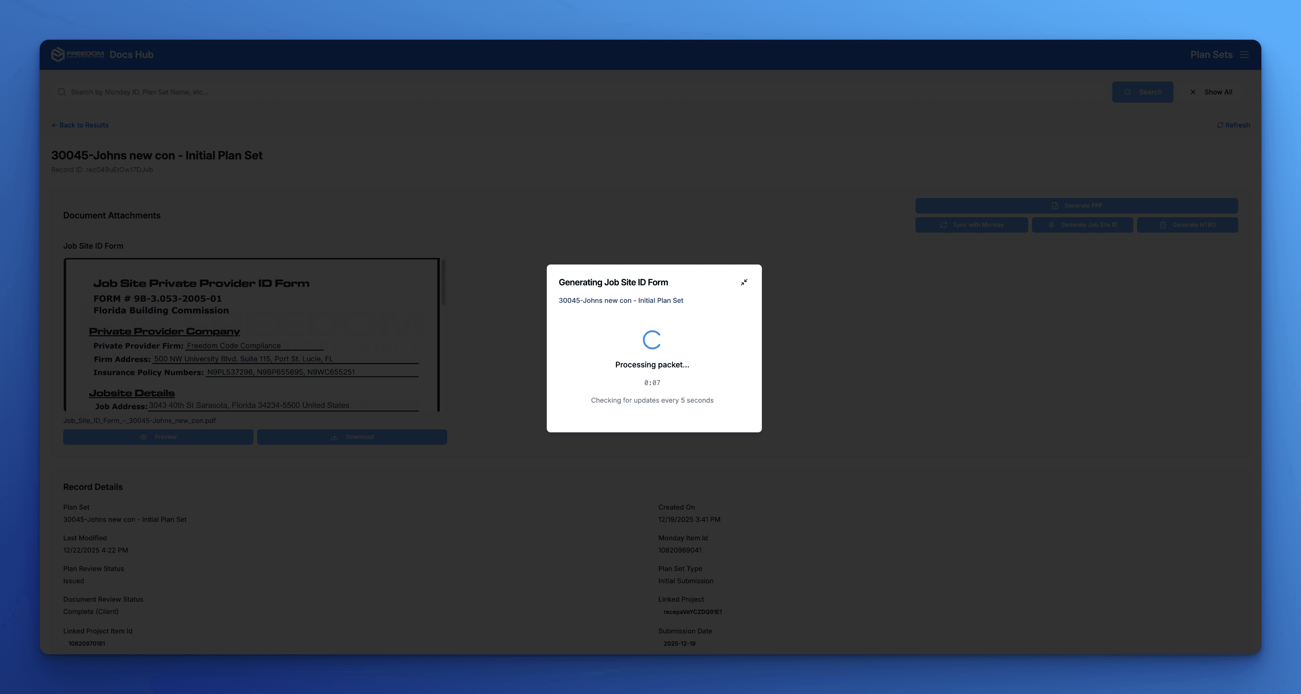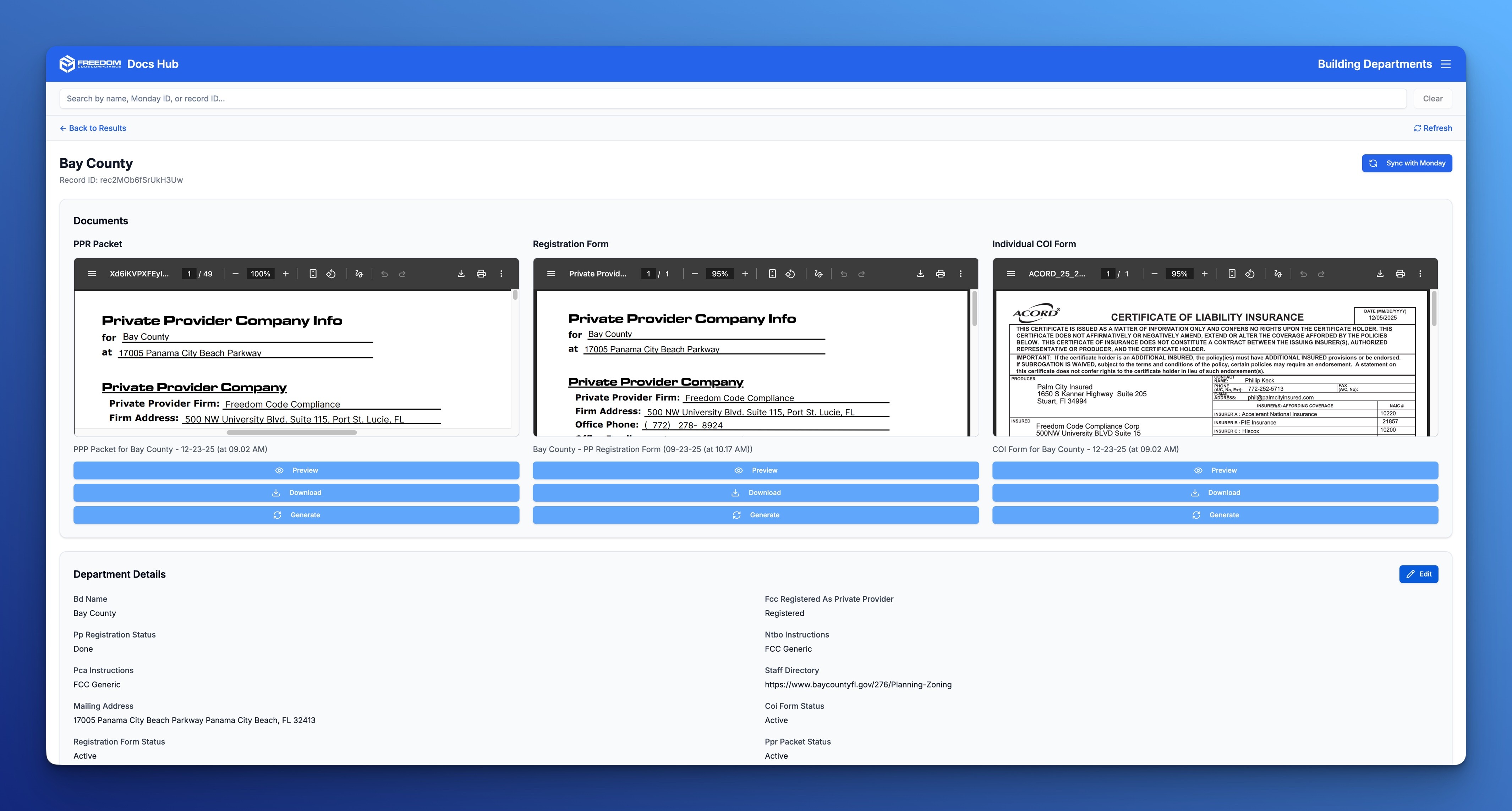 Freedom Code Compliance needed to generate complex compliance documents for clients—certificates of insurance (COI), private provider packets (PPP), DAR packets, and more. The process was entirely manual, requiring team members to pull data from multiple sources, navigate dozens of clicks across different tools and sites, and spend 30-45 minutes per document.