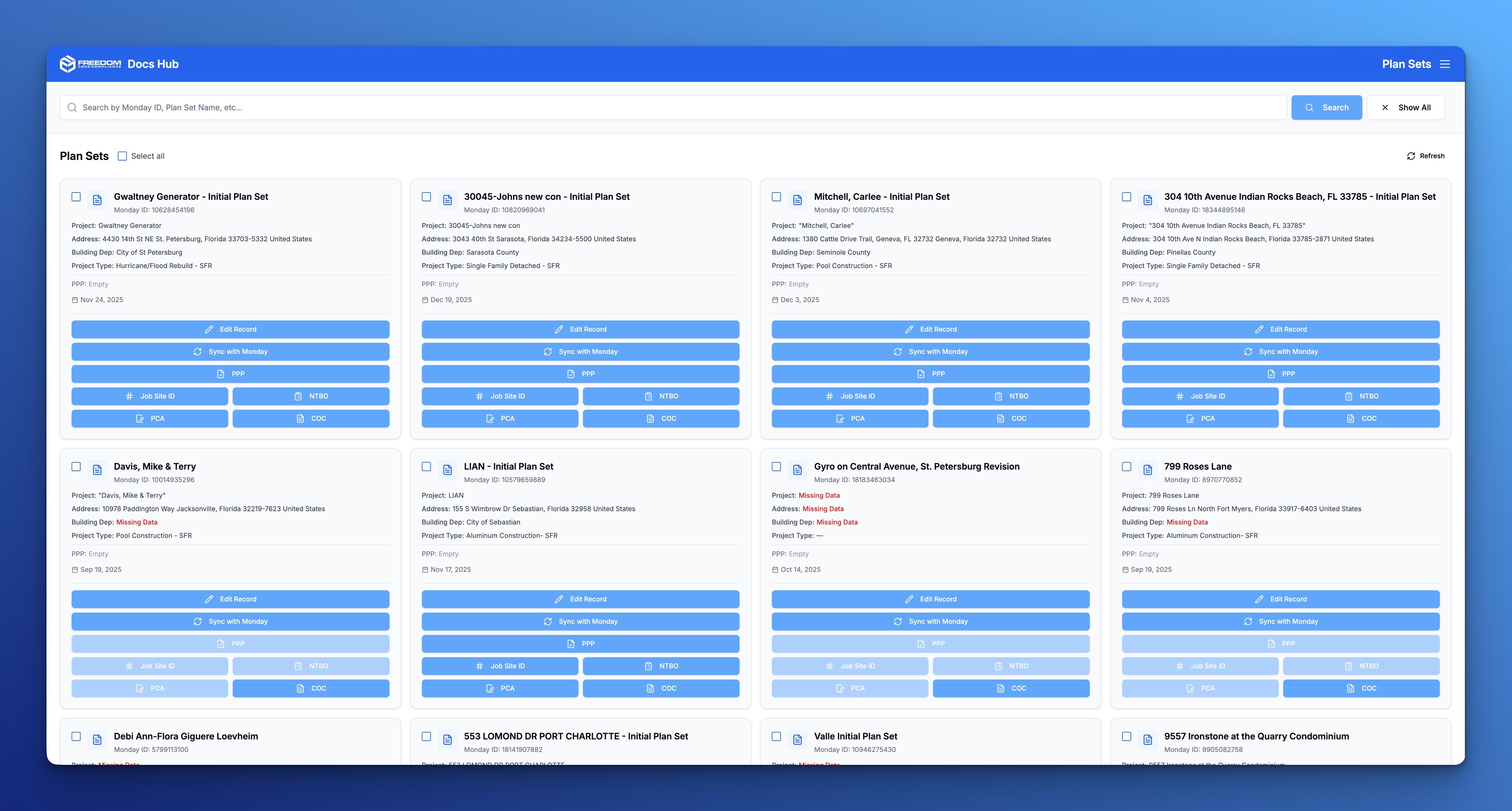 Built a custom user interface where team members can search for projects, preview records, and trigger document generation with a single click. The app includes intelligent validation—buttons are automatically disabled if required data is missing (project name, address, billing department, etc.), preventing incomplete document generation.